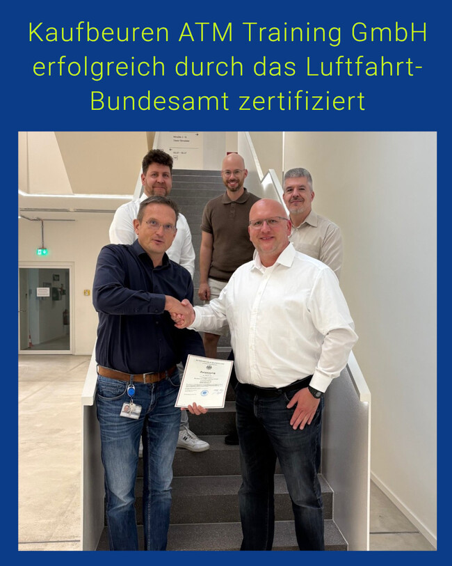 Am 09. September 2025 wurde die Kaufbeuren ATM Training GmbH vom Luftfahrt-Bundesamt als Genehmigte Ausbildungseinrichtung (NTO) zur Ausbildung von Flugdienstberatern zertifiziert. NTO steht für National Training Organisation. Mit dieser Anerkennung ist die KAT nun offiziell berechtigt, Flugdienstberater eigenständig auszubilden – ohne Unterstützung durch externe Partner. Dies ist ein wichtiger Meilenstein für die Öffentlich Private Partnerschaft mit der Bundeswehr. “Unsere Firma gewinnt dadurch mehr Unabhängigkeit, Flexibilität und Handlungsspielraum in einem zentralen Geschäftsbereich”, sagt KAT-Geschäftsführer Jan Herchenröder. “Der Dank gilt allen, die mit ihrem Engagement, ihrer Expertise und ihrem Einsatz diesen Erfolg möglich gemacht haben.”